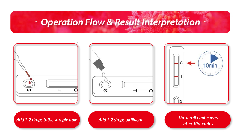 Draw and transfer 1 drop (approximately 30μl) of whole blood (or 20μl serum or plasma)to the sample well of the test device, then add 2 drops of Assay diluent (approximately 60μl) and start the timer.